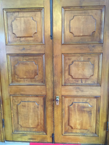 啓蒙所と言うエントランスと聖所(礼拝堂)の扉。木目や木材の節に至るまで精緻(せいち)な手書き仕上げ。説明を受けるまで全く気づきませんでした。