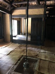 囲炉裏の煙に燻されて飴色に光る太い梁。昼でも漆黒の闇が潜む生活の場。絶えず燻蒸されて呼吸する茅葺屋根。移築されたものでありながら、染みつき蓄積された生活の匂いは濃いままに残っています。