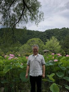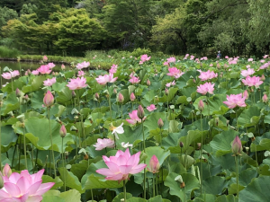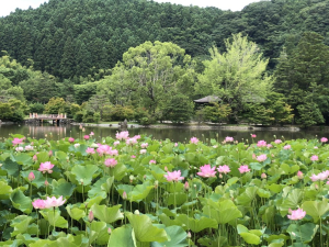 咲き誇る蓮の花・天竺の池かと。蓮池を挟んで阿弥陀堂清らかさを失わず歩んで行きたいものです。