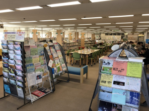 フリースペースで会話を楽しむ若く国際色豊かな学生グループから
