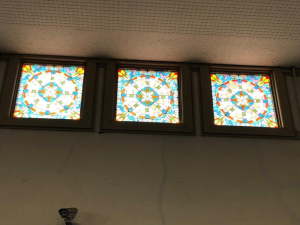 車寄せがある正面玄関、明り取りの窓はステンドグラスが。
