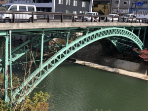 飯坂温泉駅を出ると、摺上川(すりかみがわ)に架かる鉄製のアーチ橋が