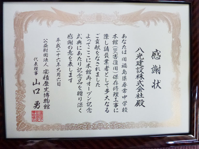HOMEお知らせ 郡山市の安積歴史博物館が再オープン!震災復旧工事に対する感謝状をいただきました!